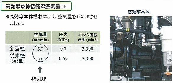 従来のPDS175S-503と比較して、空気量が5.0→5.2m3/minとアップ。